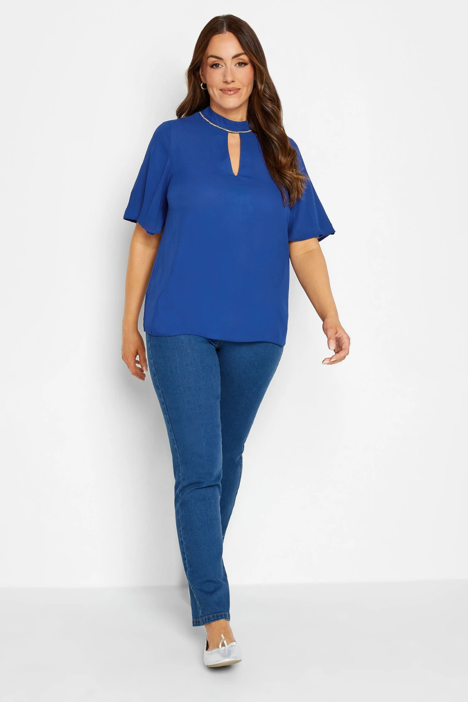 Are you heading out after work? You’ll transition from day to night seamlessly with this blouse and make a real impact on those around you with its embellished neckline and keyhole front. The woven fabric will provide comfort all day while the short frill sleeves and simple design will cut a sleek figure to pair with denim for a stylish outfit you can rely on.