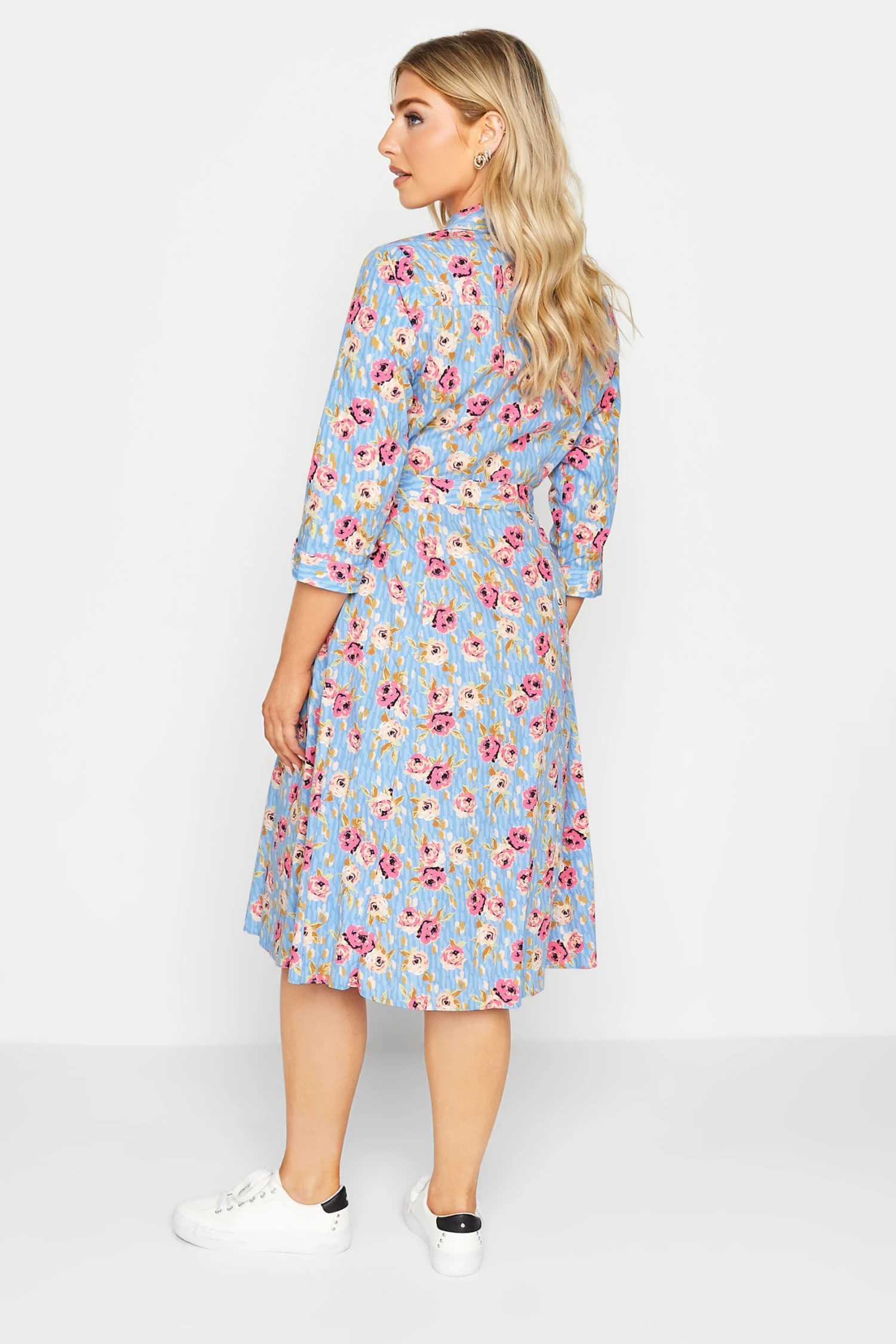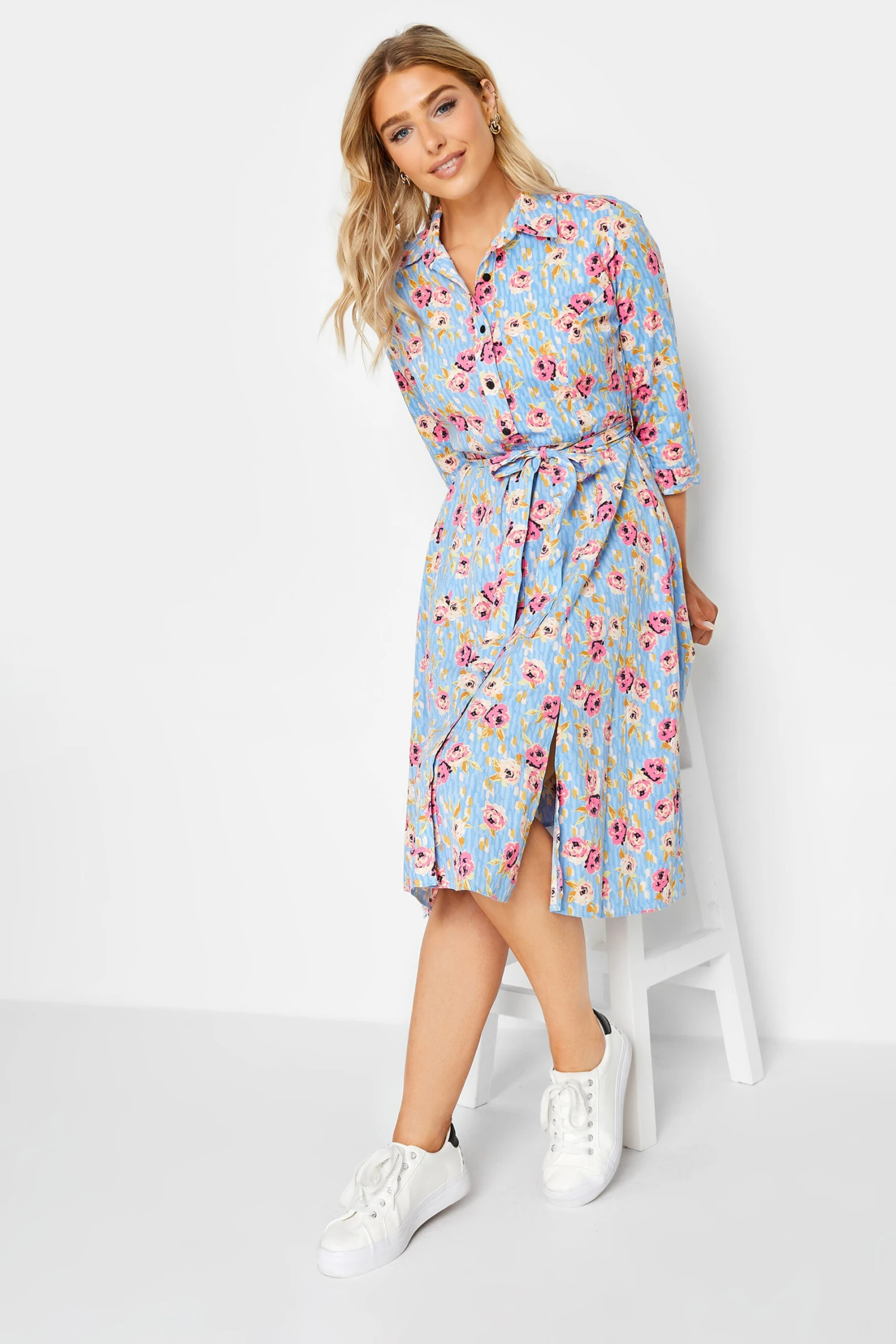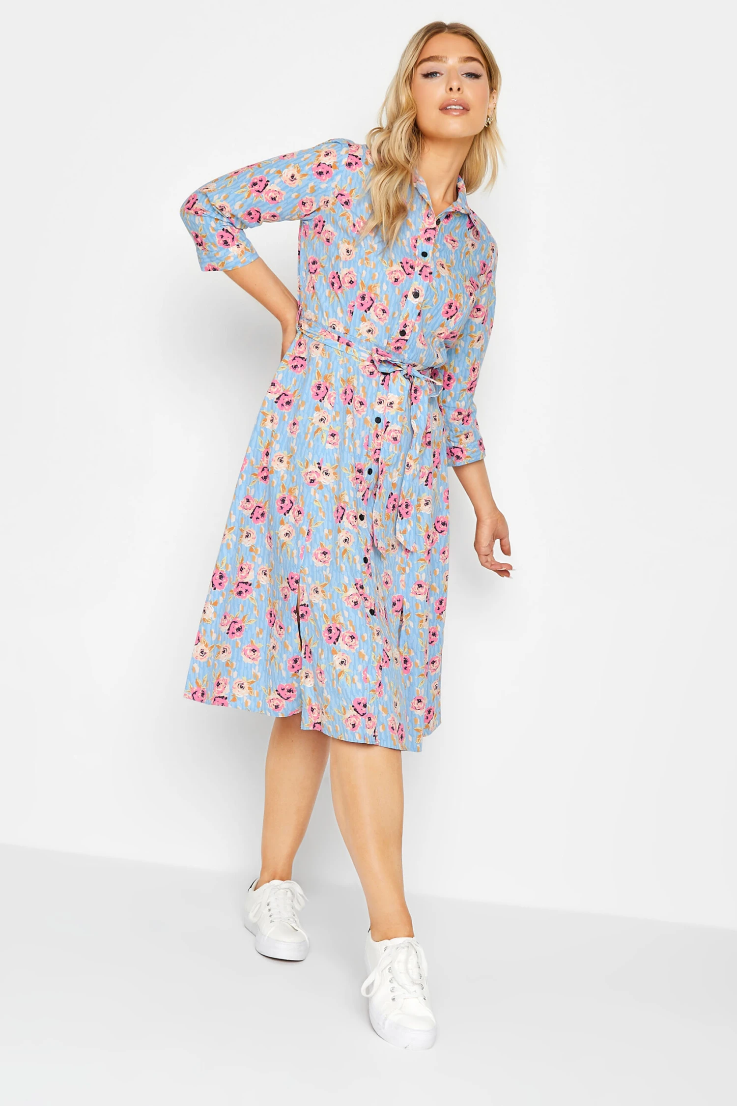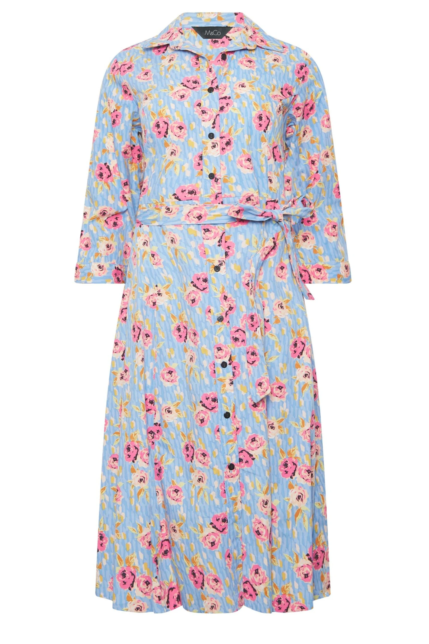 Enjoy the summer in this new-in shirt dress. Made from a comfortable woven fabric, it features a v-neckline, classic collar and button through fastenings with a tie waist and 3/4 length sleeves, complete in a floral print. Style with heels or sandals to suit your occasion.