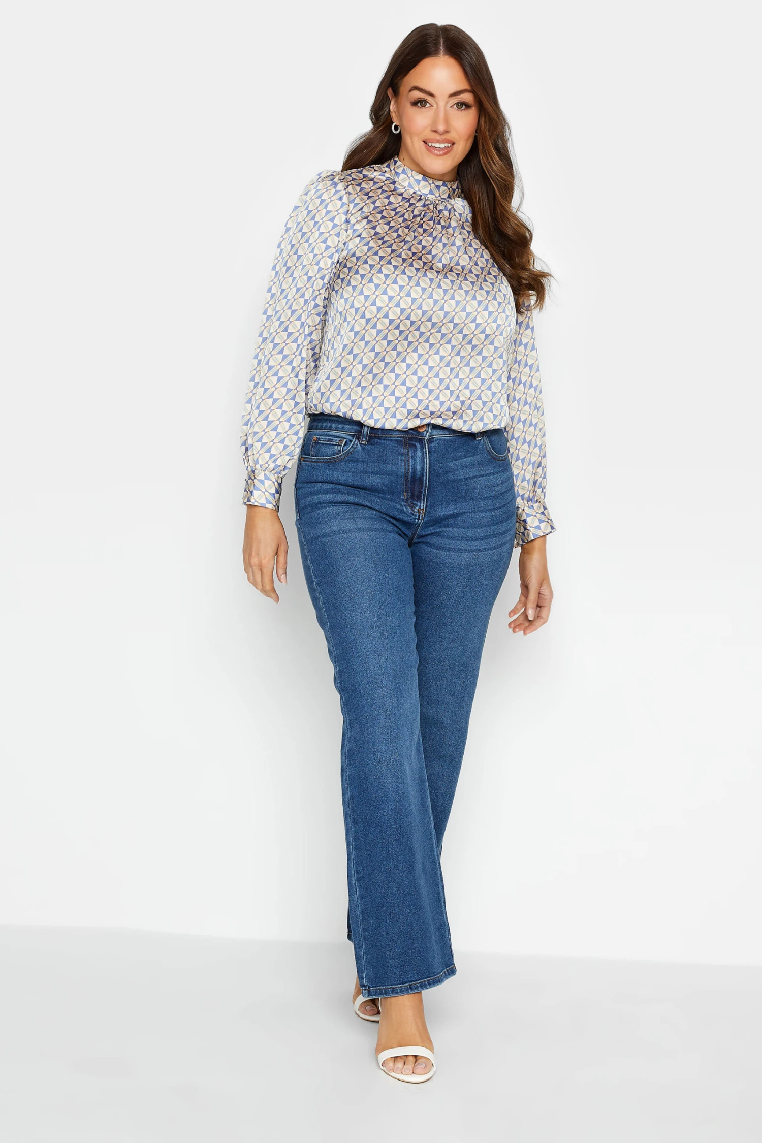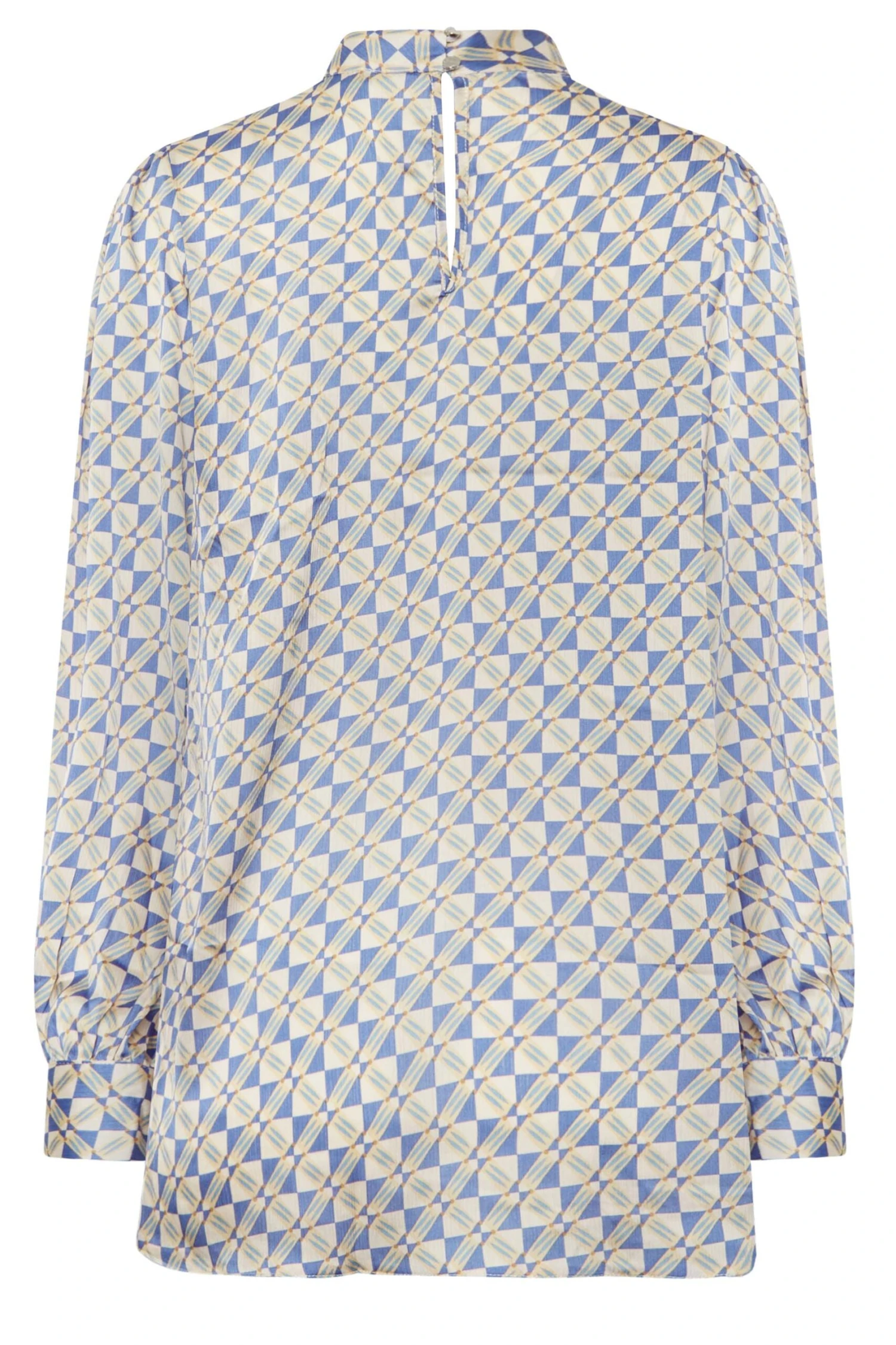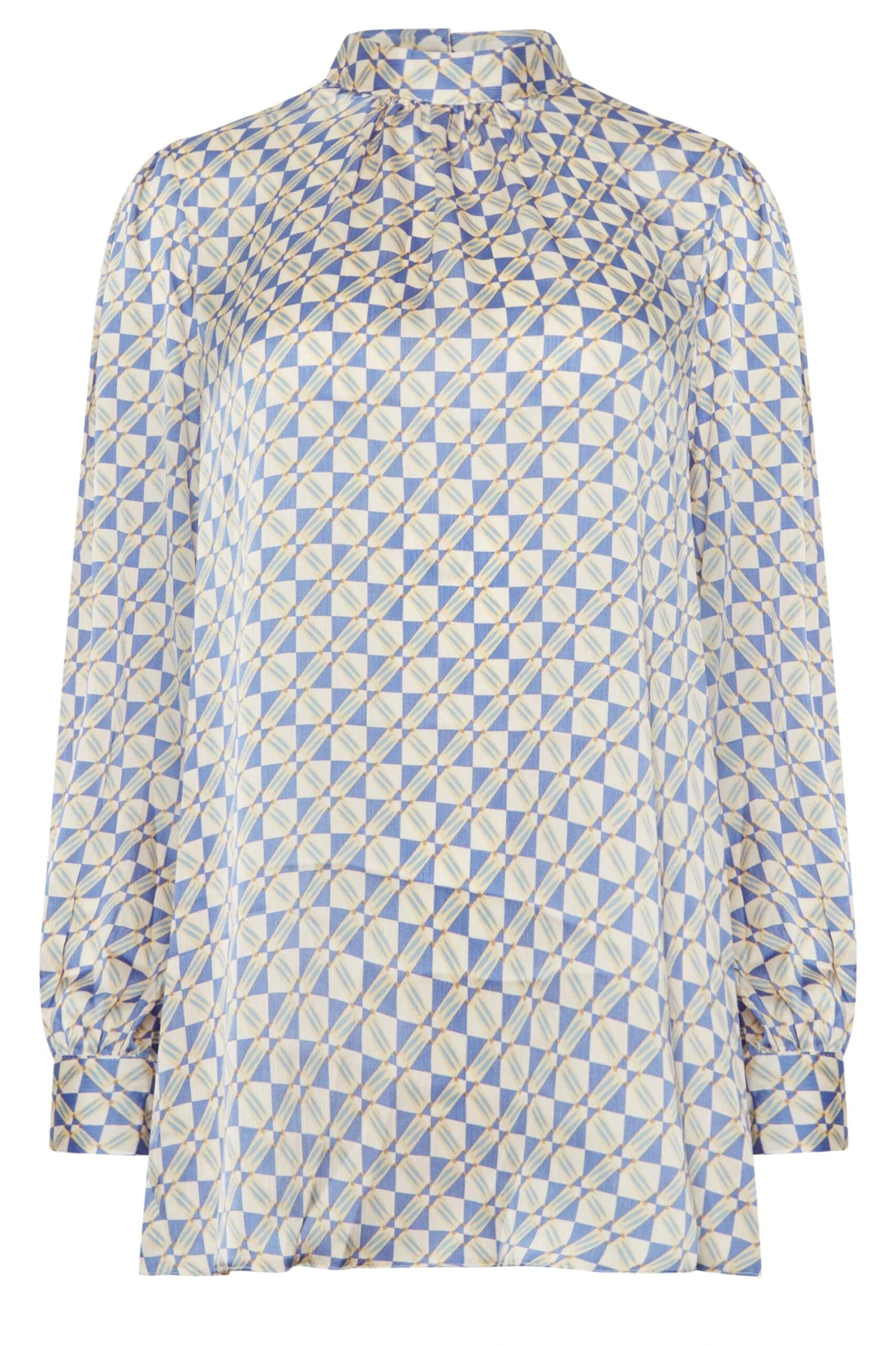 The perfect blouse for day-to-night dressing. Made from a soft satin fabric, it features a high neckline with pleated details, a back button keyhole fastening, and long sleeves. Finished in a geometric print, style with trousers and heels for an effortless workwear look.