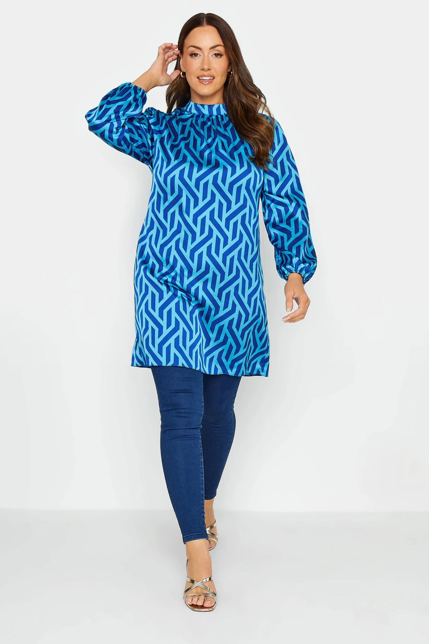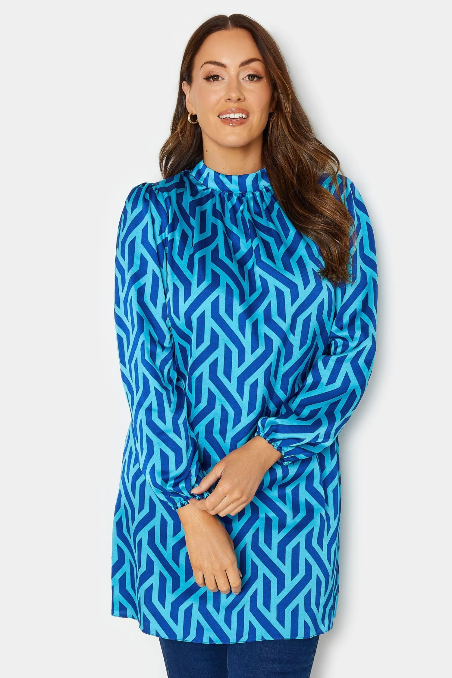 Add some pretty prints to your everyday wardrobe. Made from a comfortable woven fabric this blouse features a geometric print, long sleeves, and a high neck style. Wear with jeans and heels for a look you’ll feel confident in.