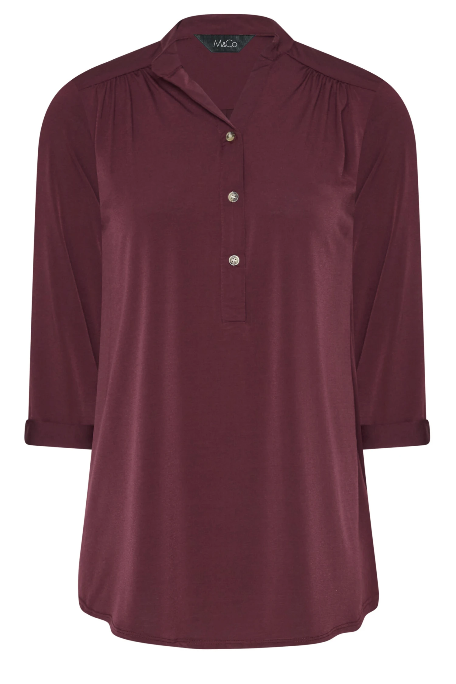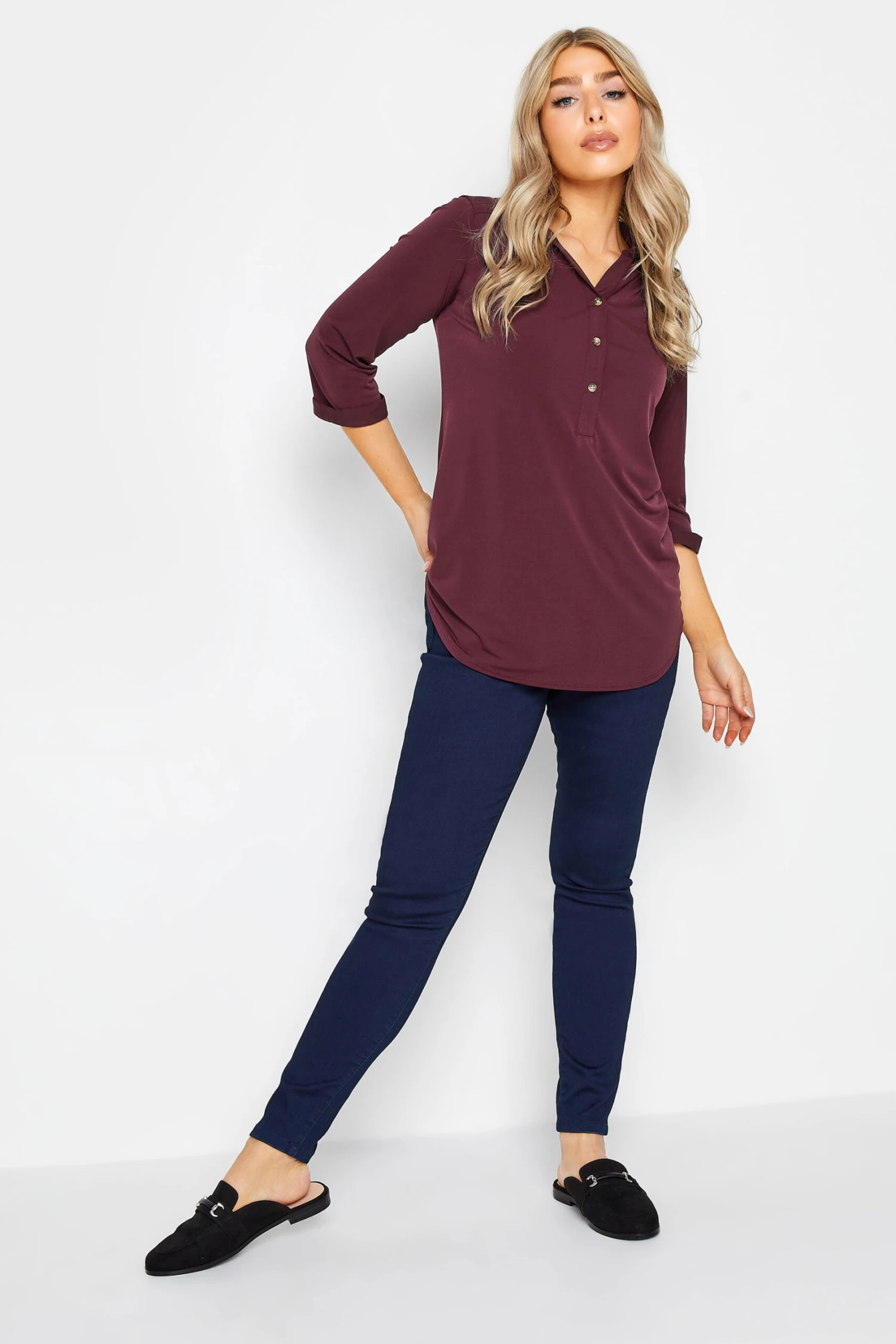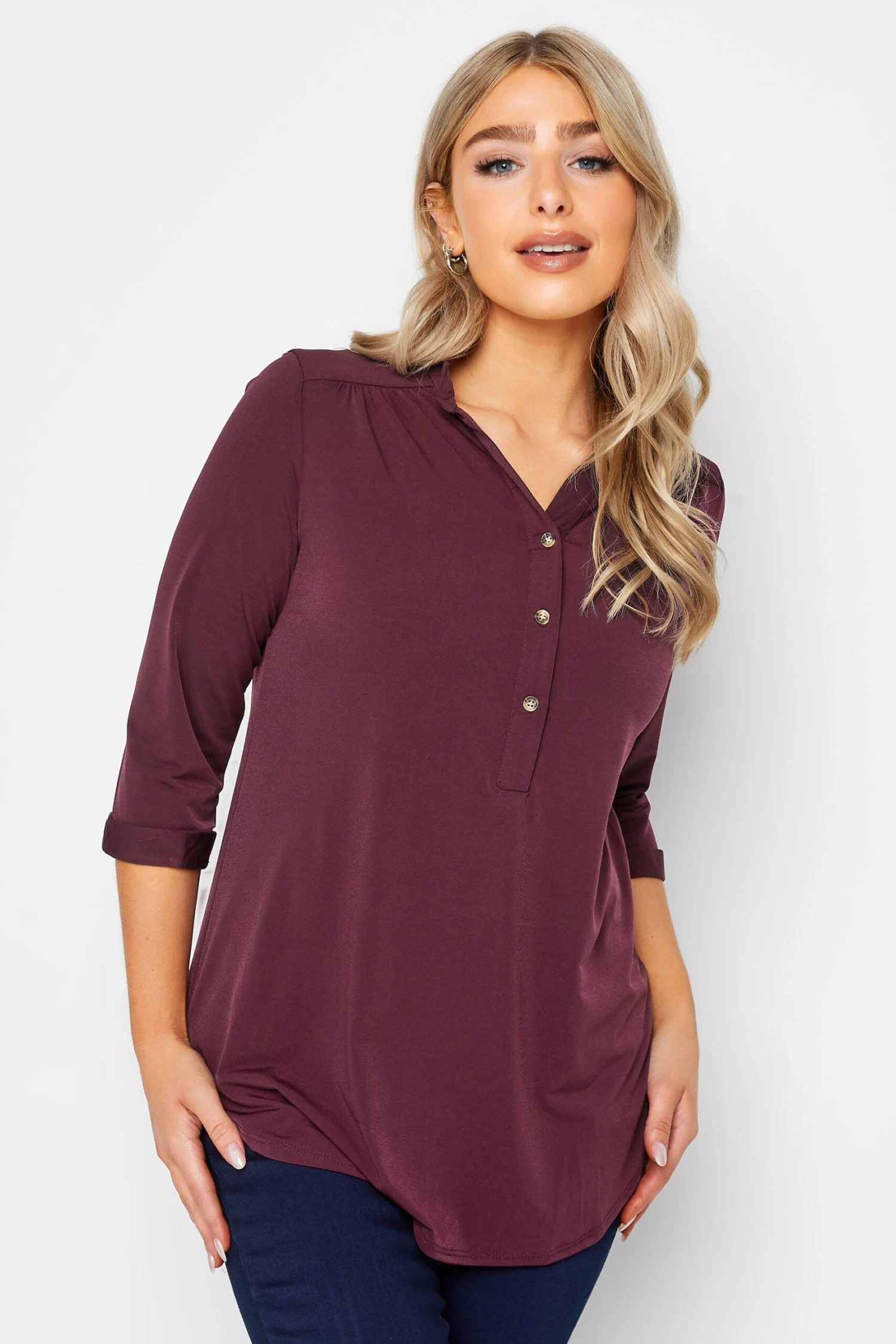 A must have this season. Made from a comfortable jersey fabric this blouse features 3/4 length sleeves, a v-neckline, and a half place look. Style with jeans and heels for a stylish work outfit.
