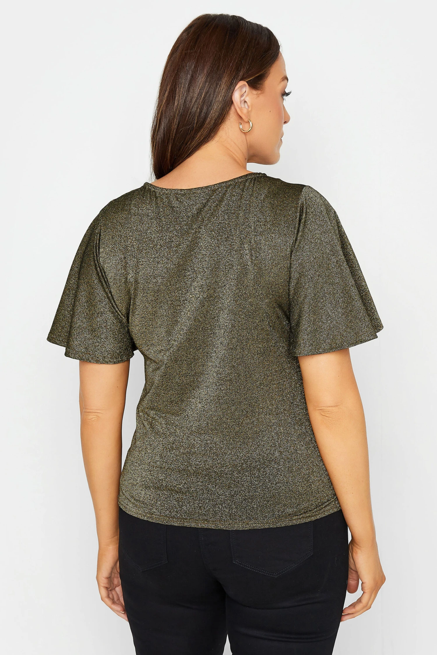 No wardrobe is complete without this shimmer top. Made from a comfortable jersey fabric, this top features short sleeves, a scoop neckline, a wrap detail, and a shimmer finish. Wear with jeans and heels for a party-ready look.