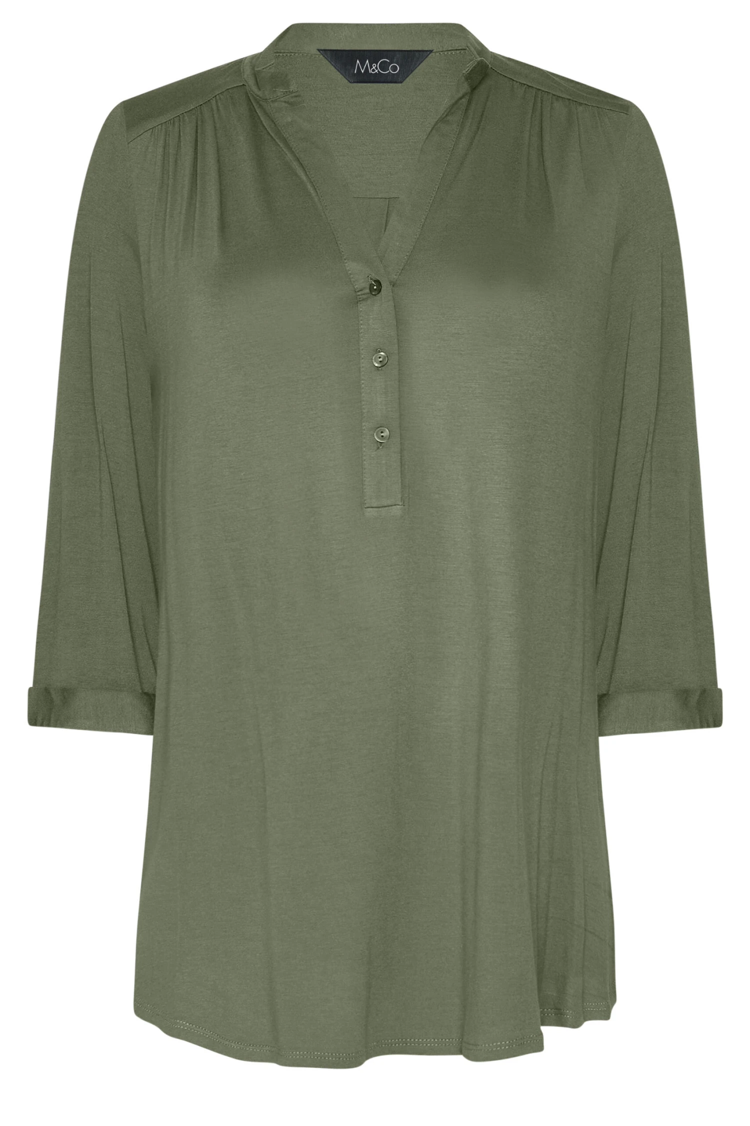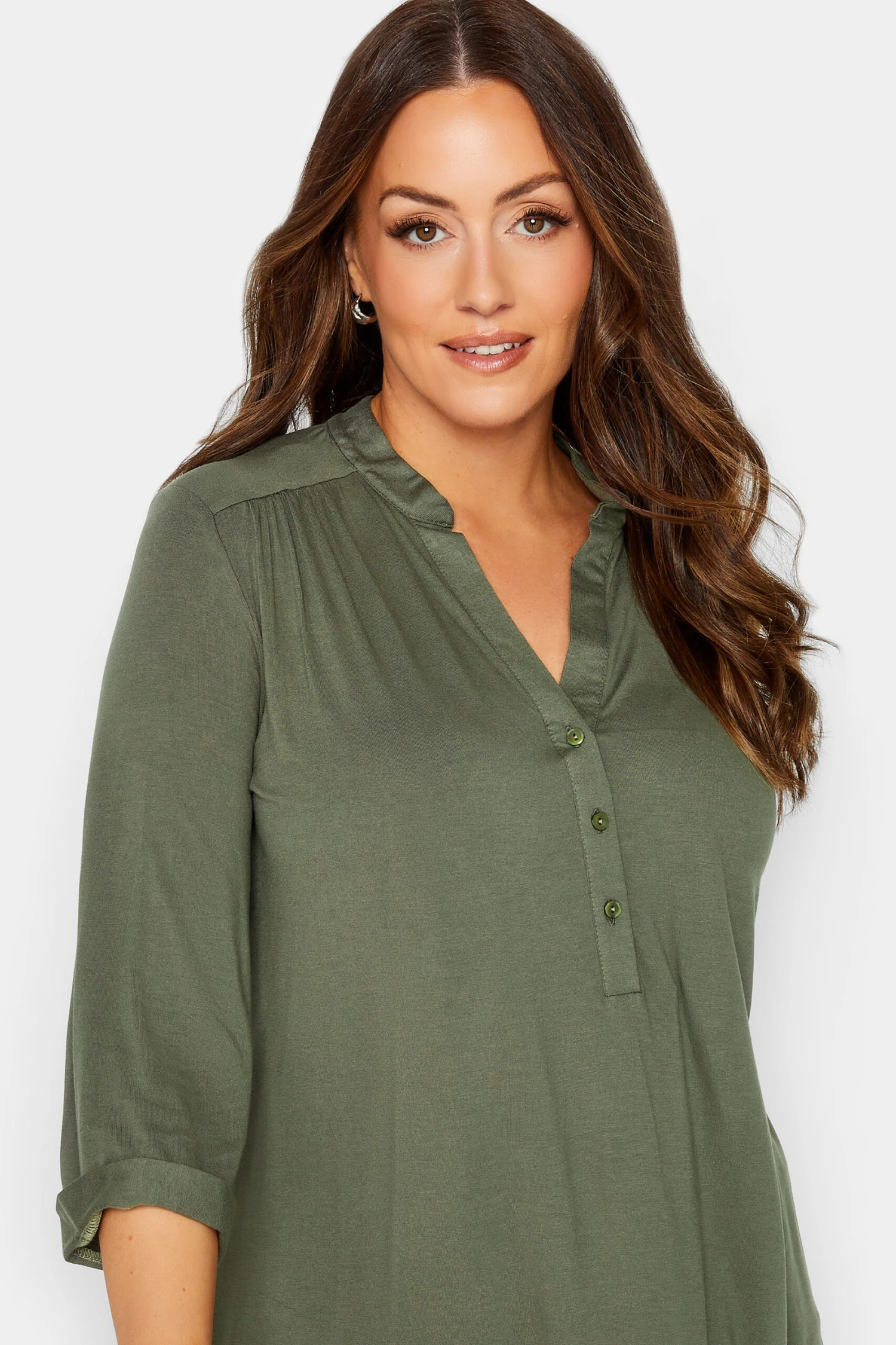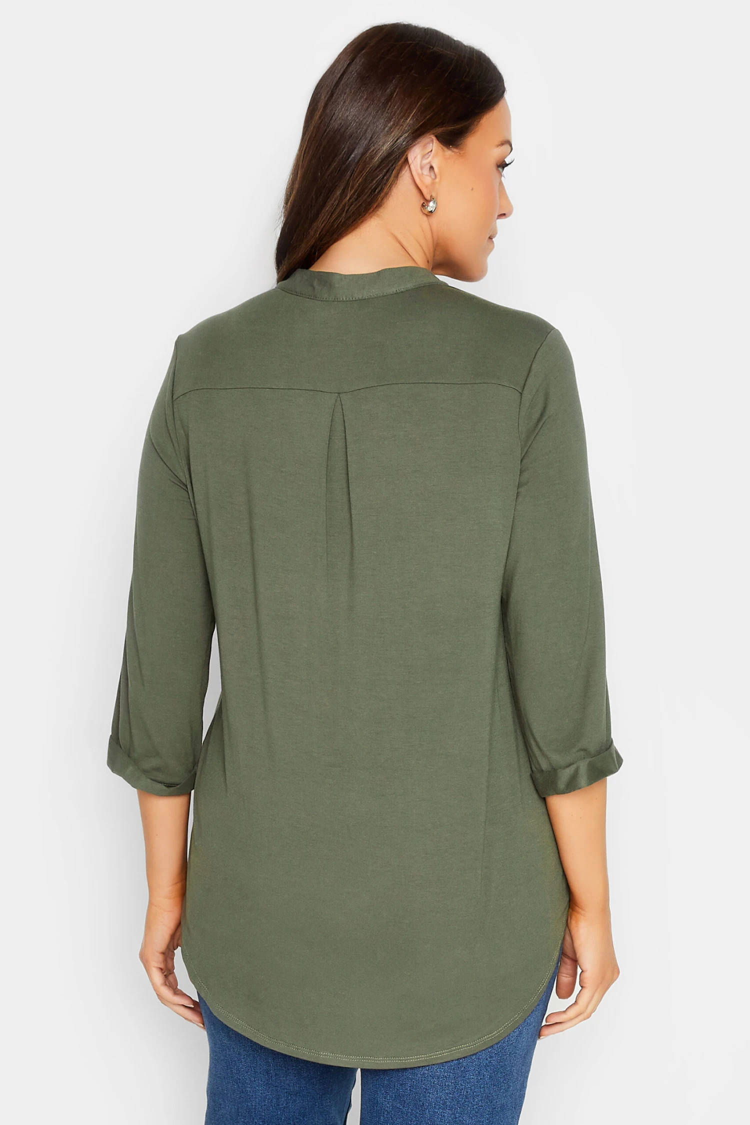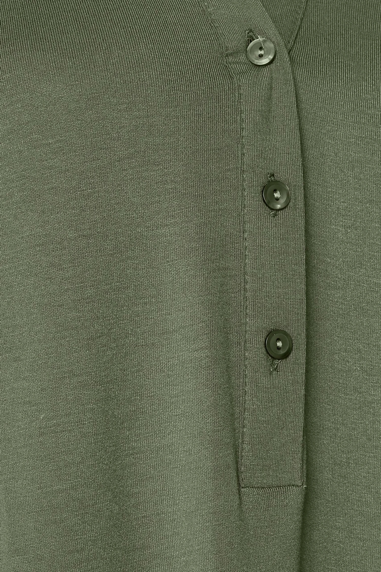 A wardrobe staple you will never tire of wearing. Made from a soft jersey fabric this top features 3/4 length sleeves, a v-neckline, and a button detail half placket look. Style with jeans and trainers for a look you can feel contentment in every time you wear it.