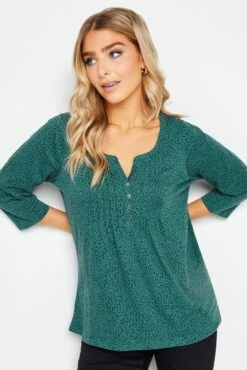 This new-in henley top is the perfect addition to your everyday wardrobe. Made from a comfortable jersey fabric, this top features 3/4 length sleeves, a faux button placket and front pleat detail, complete in a spot print. Style with jeans and trainers for a casual look.