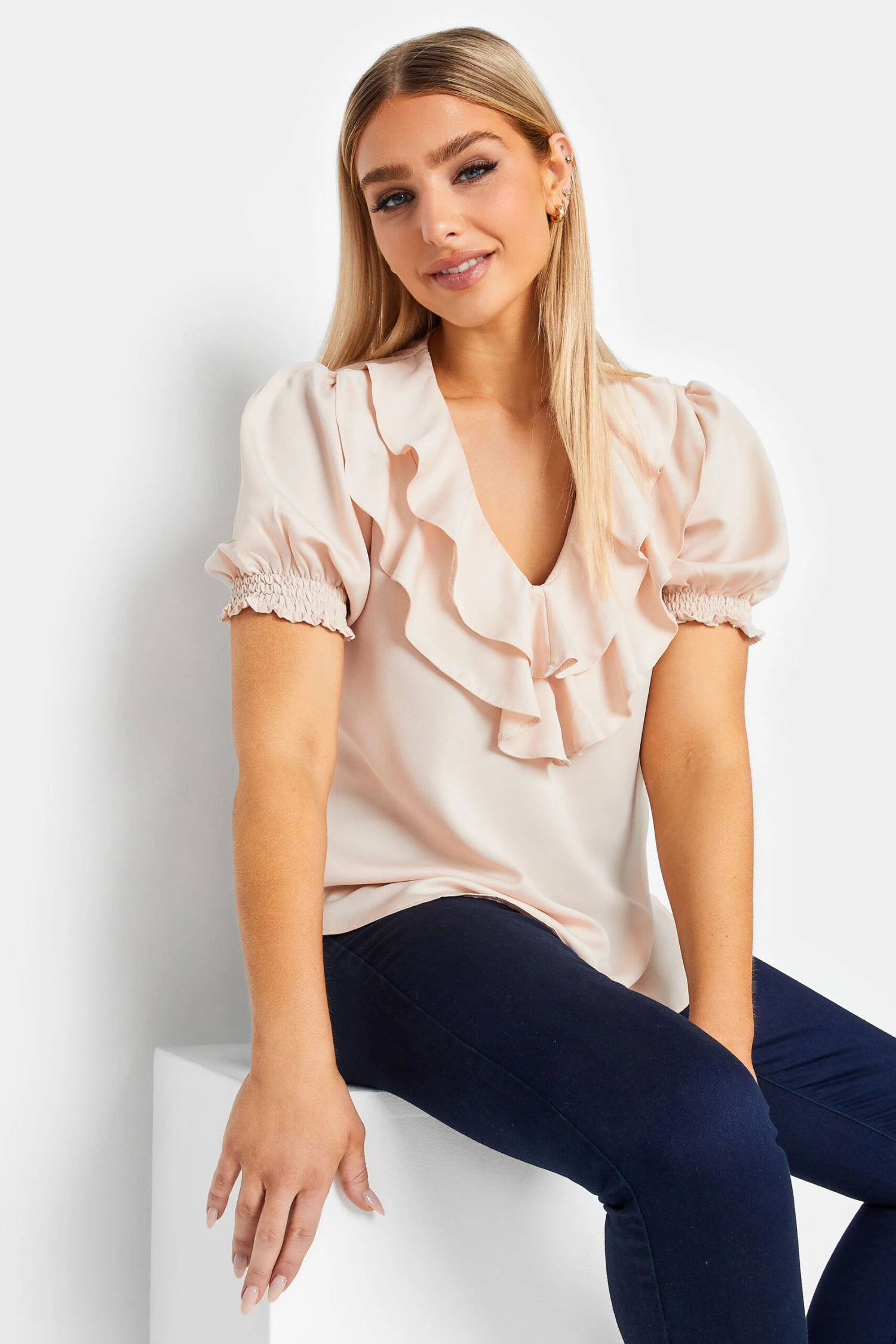 A must-have blouse to take you from work to the weekend. Made from a comfortable woven fabric, it features a v-neckline with frill front detail and short sleeves with elasticated cuffs. Style with trousers and heels for an effortless workwear look.