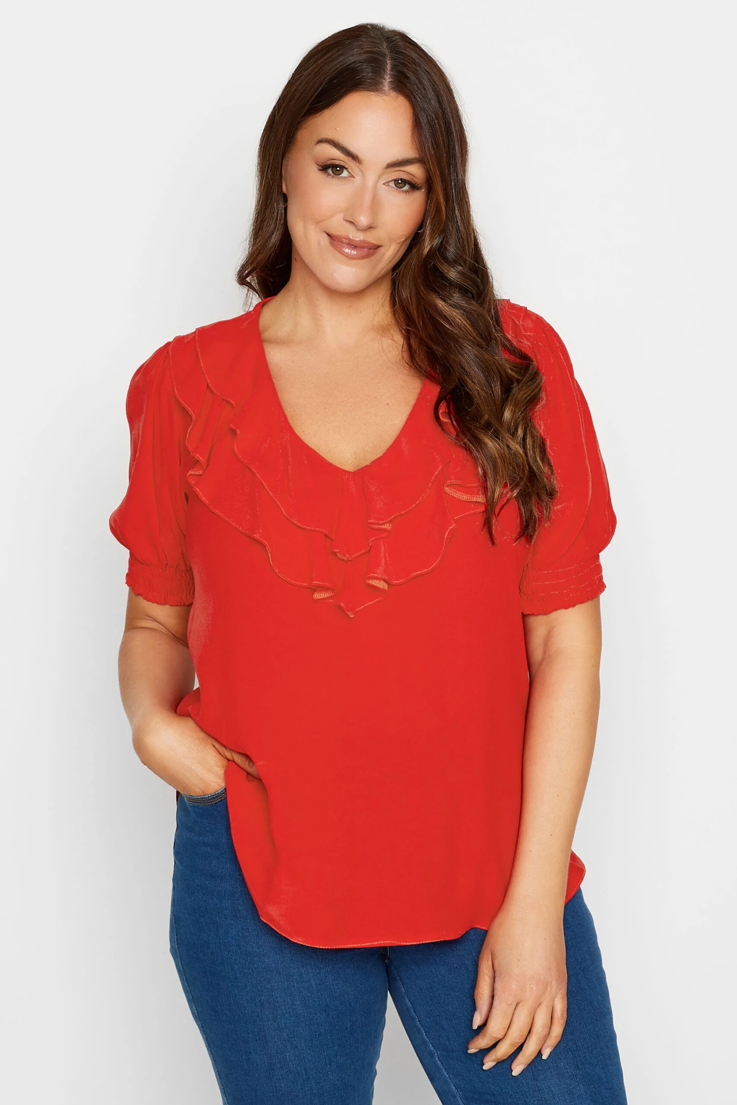 A must-have blouse to take you from work to the weekend. Made from a comfortable woven fabric, it features a v-neckline with frill front detail and short sleeves with elasticated cuffs. Style with trousers and heels for an effortless workwear look.