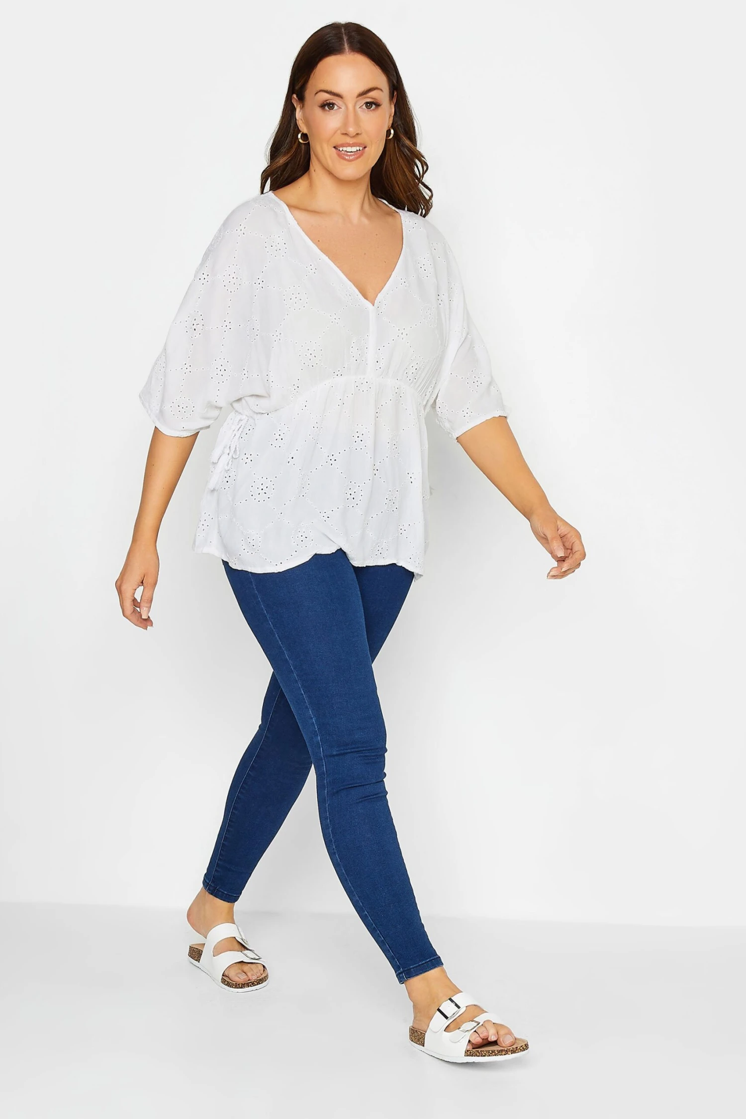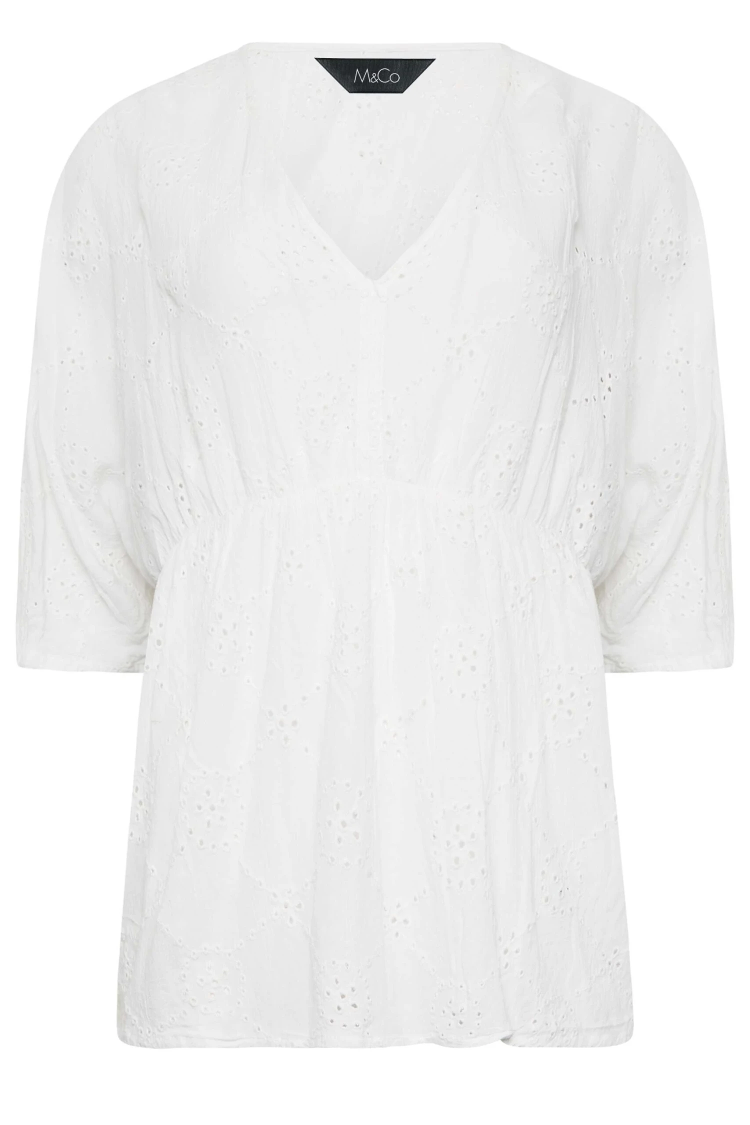 Get ready for summer in style with the new broderie top. Made from a comfortable woven fabric, this top features 3/4 length sleeves, a broderie design, and a v-neckline. Style with jeans and sandals for a look you can wear with confidence!