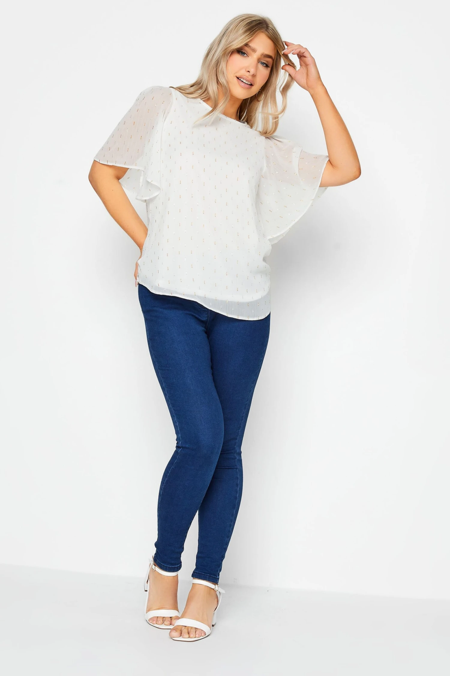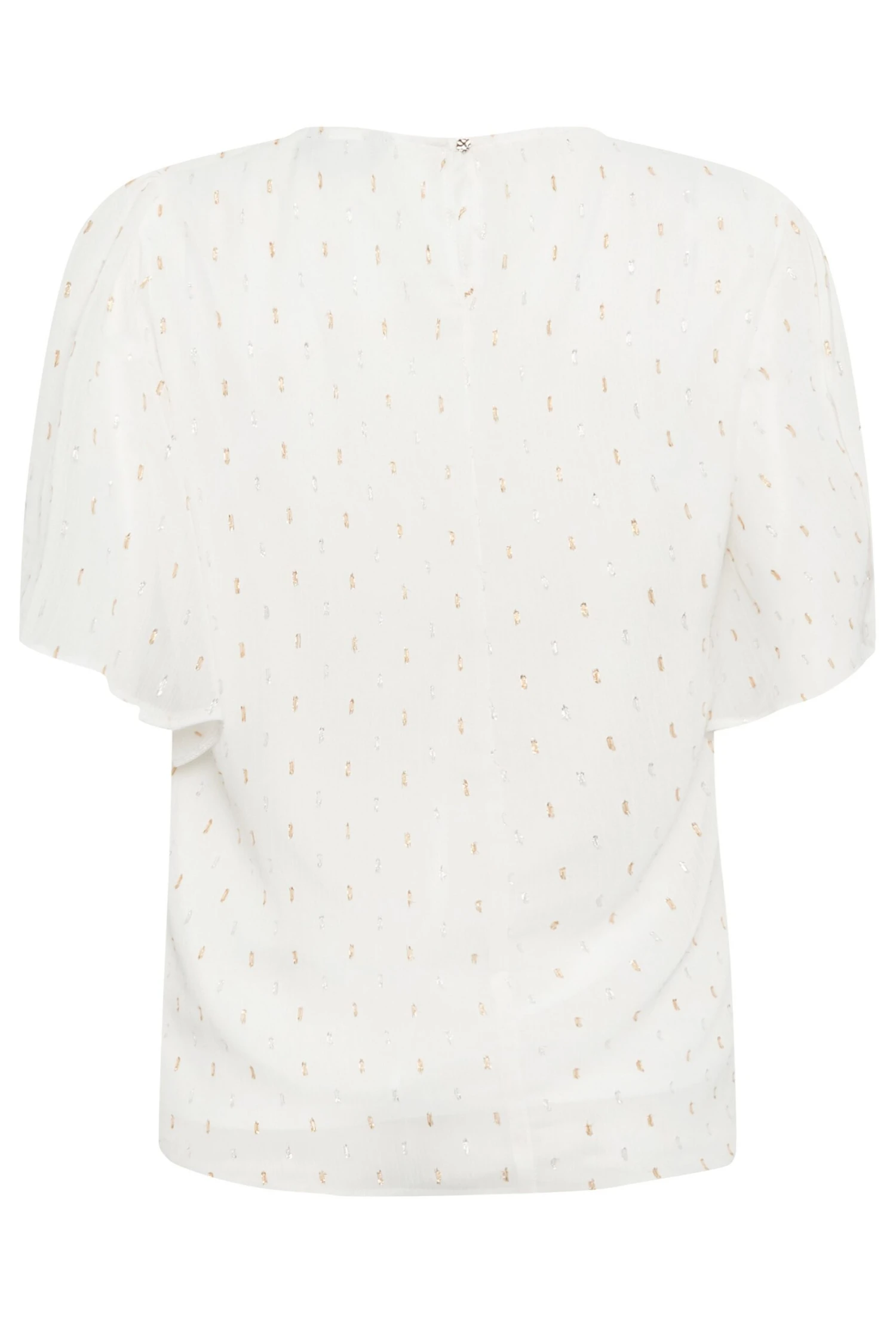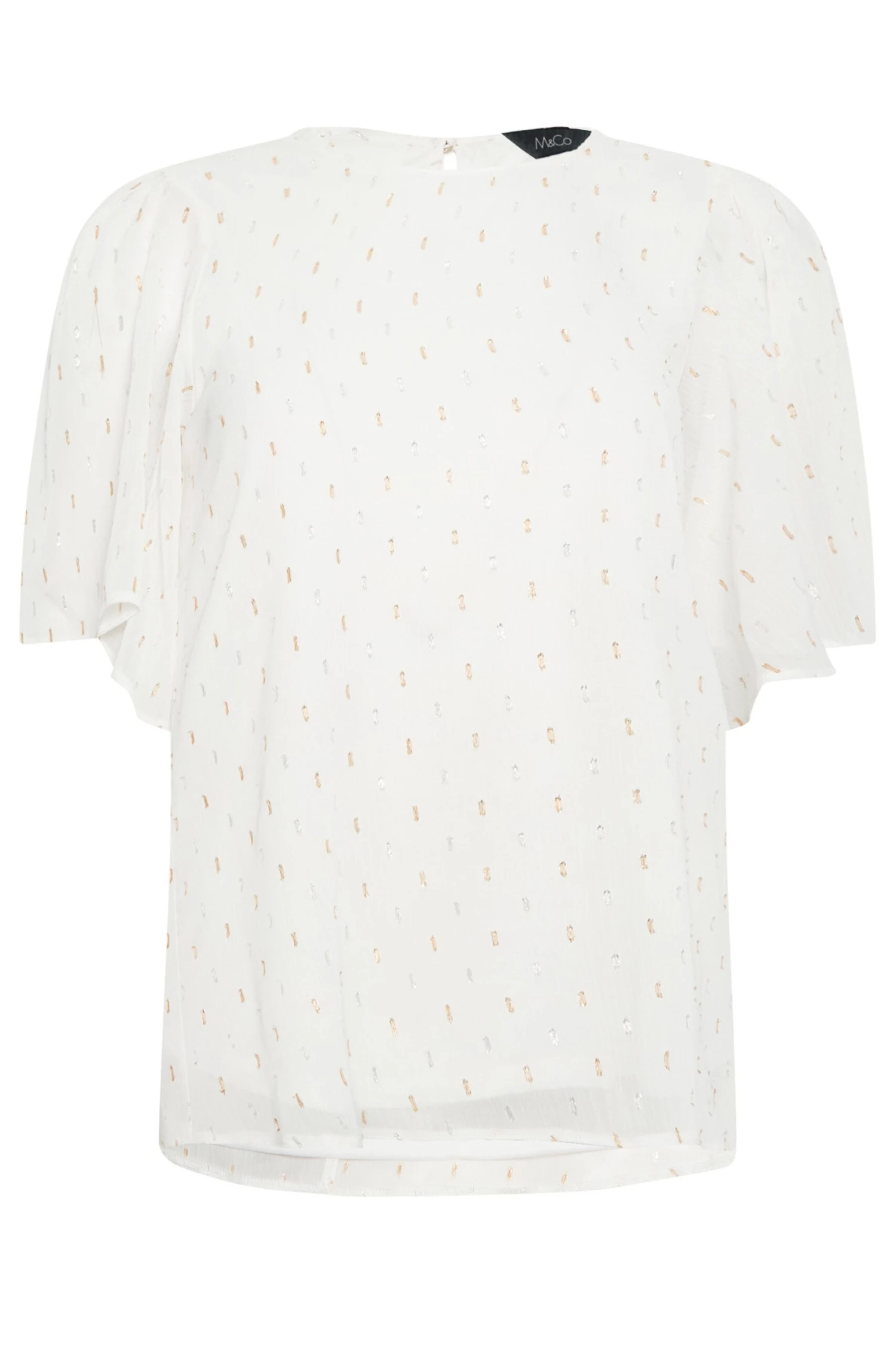 Perfect to take you from the desk to dinner! Made from a comfortable woven fabric, this blouse features short sleeves, a scoop neckline, and a glitter detail. Style with jeans and heels for a look you can wear with confidence.