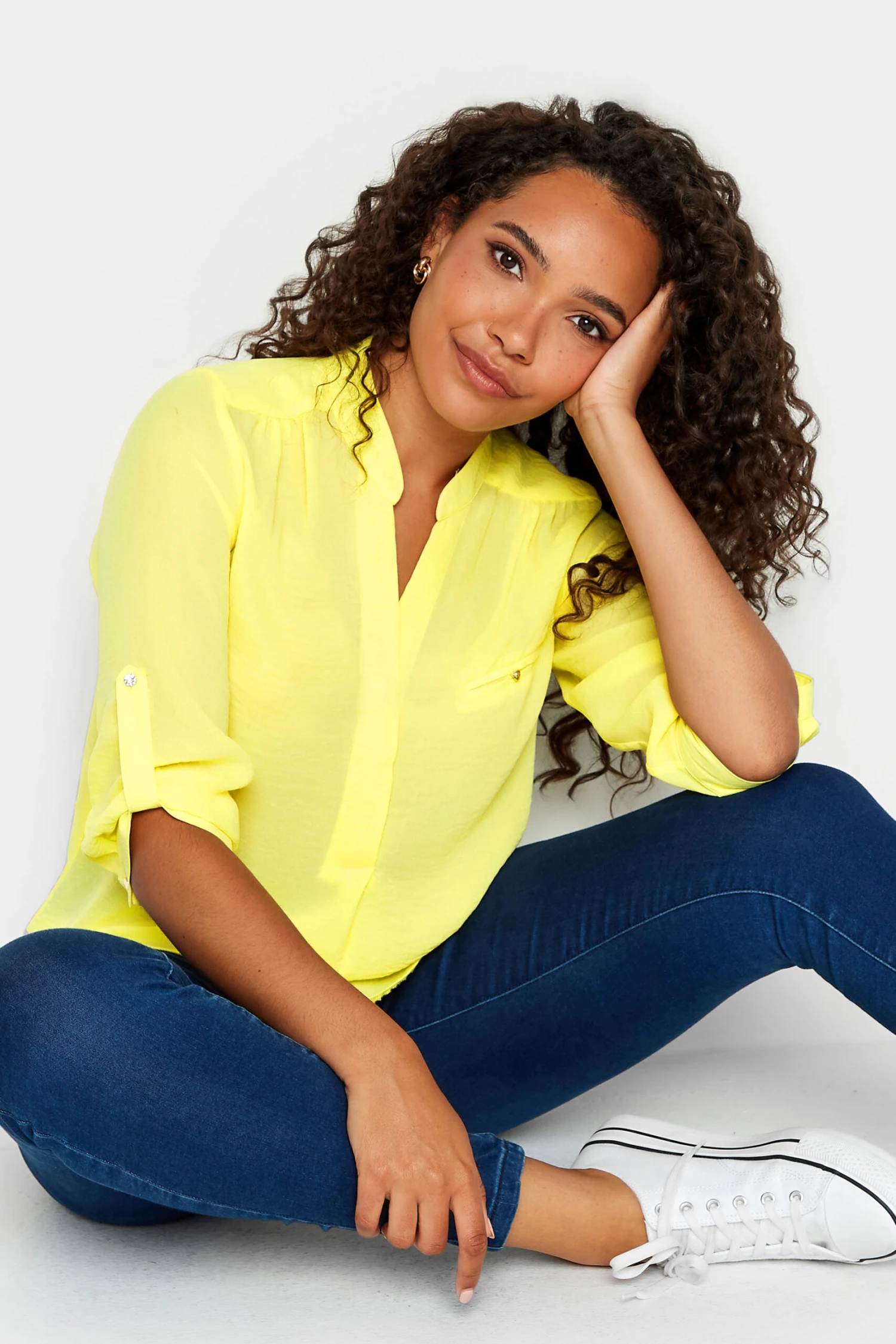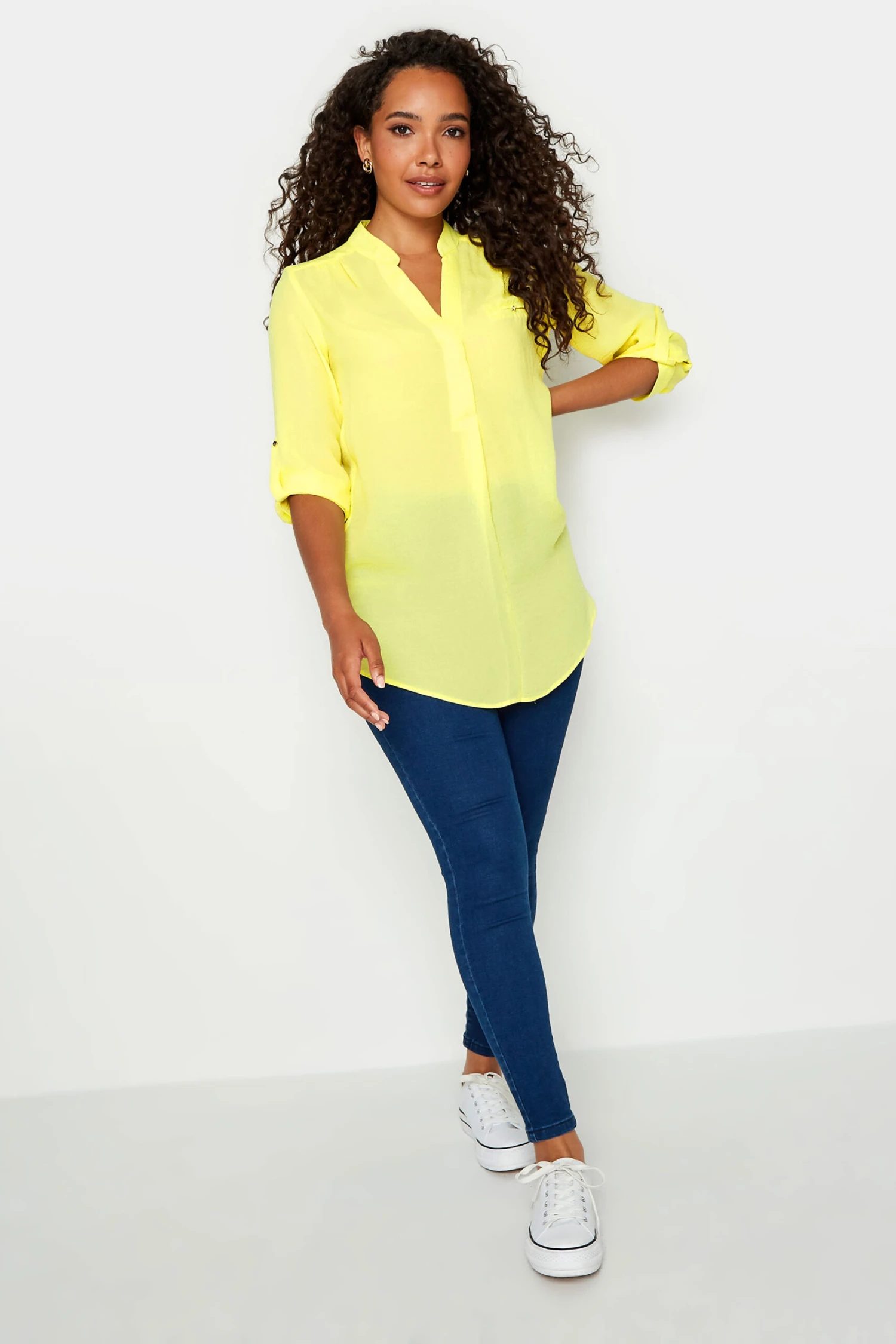 This new-in blouse is the perfect option to take you from desk-to-dinner in style. Made from a comfortable woven fabric, it features 3/4 length roll tab sleeves with a mock chest pocket and v-neckline. Complete the look with trousers and loafers for a smart-casual look.